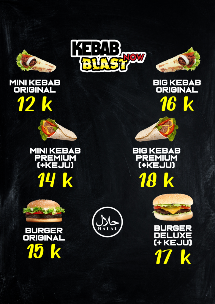 Nikmati kebab lezat, burger menggoda, dan hotdog spesial dari Kebab Blast yang siap memanjakan selera Anda.